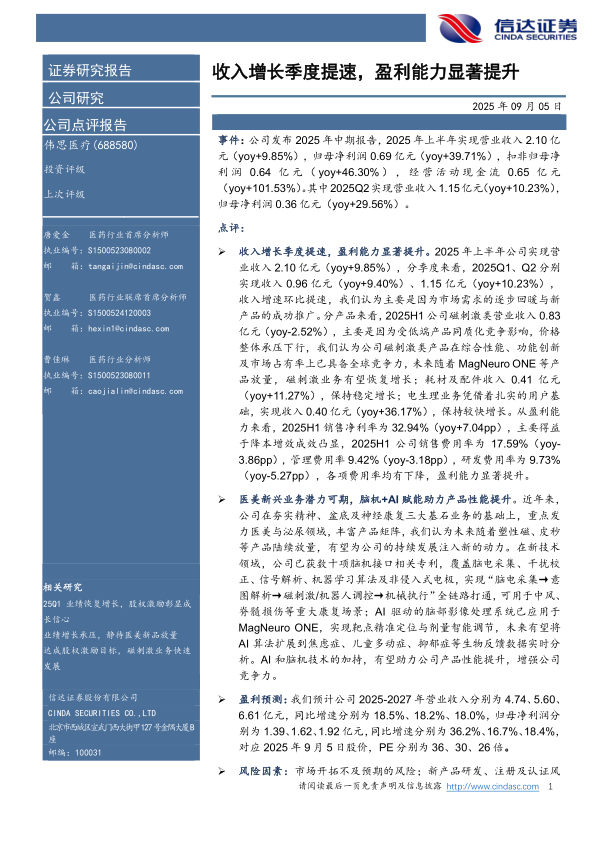本报告分析了公司2025年中期报告,指出公司在收入增长和盈利能力方面均表现出色,主要受益于市场需求回暖和新产品推广。同时,公司积极拓展医美和泌尿领域,并利用脑机接口和AI技术赋能产品,有望为公司带来新的增长动力和竞争优势。报告还对公司未来几年的收入和利润进行了预测,并提示了相关风险。