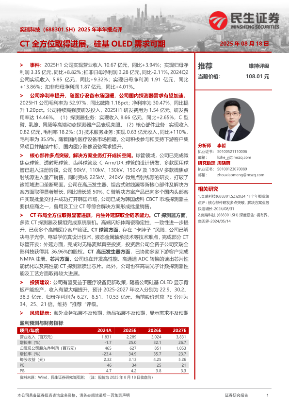 奕瑞科技2025年半年报显示,公司在营收、净利润等方面均取得稳健增长。国内医疗设备市场回暖和集采项目的积极参与,推动了国内探测器需求的加速。公司在核心部件和解决方案业务上的突破,以及在CT领域的全方位布局,为未来的增长提供了强劲动力。维持“推荐”评级,主要考虑到公司有望受益于医疗设备更新政策以及硅基OLED显示背板产能投产带来的收入增长。
