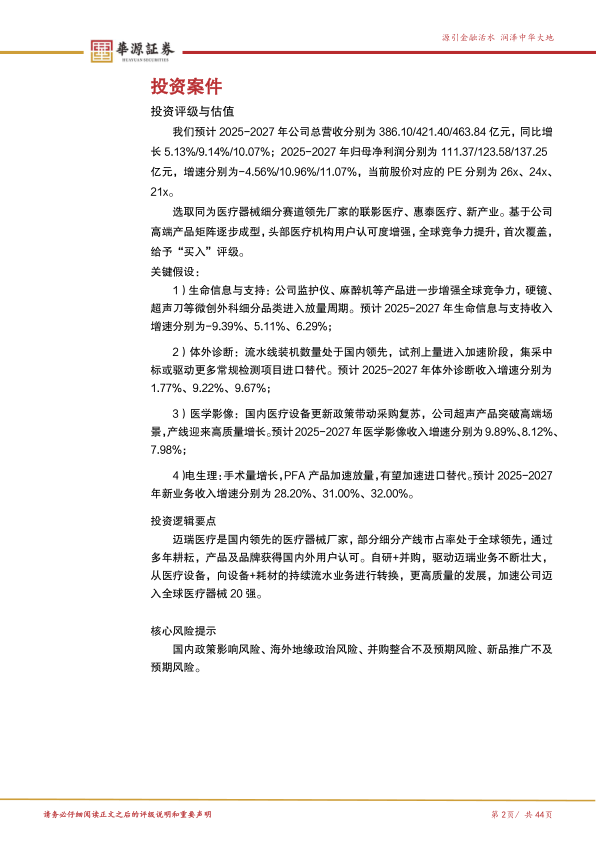 盈利预测与估值。我们预计2025-2027年公司总营收分别为386.10/421.40/463.84亿元,同比增长5.13%/9.14%/10.07%;2025-2027年归母净利润分别为111.37/123.58/137.25亿元,增速分别为-4.56%/10.96%/11.07%,当前股价对应的PE分别为26x、24x、21x。选取同为医疗器械细分赛道领先厂家的联影医疗、惠泰医疗、新产业,25年可比公司平均PE为47倍。基于公司高端产品矩阵逐步成型,头部医疗机构用户认可度增强,全球竞争力提升,首次覆盖,给予“买入”评级。