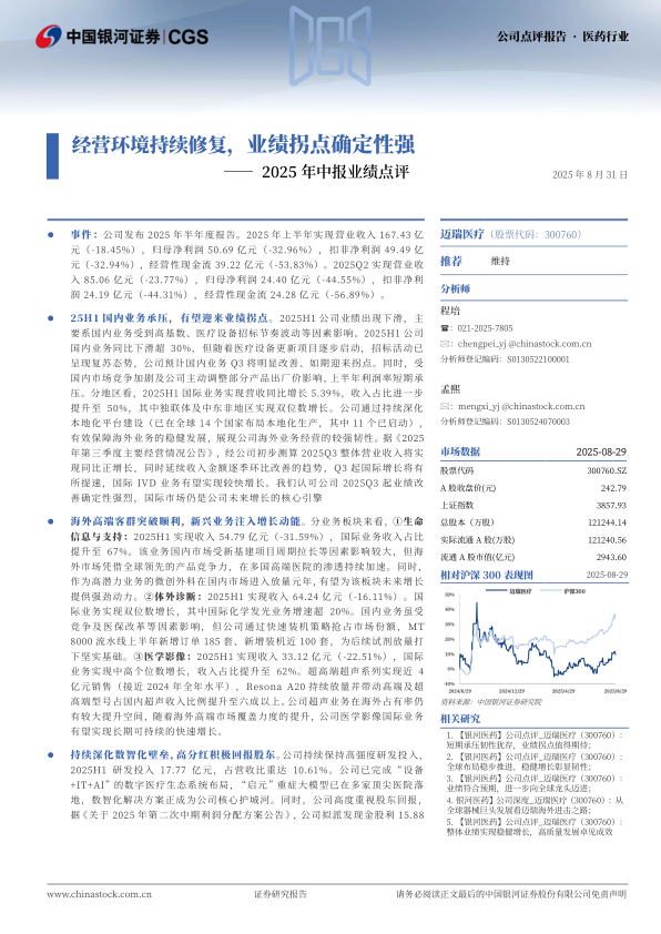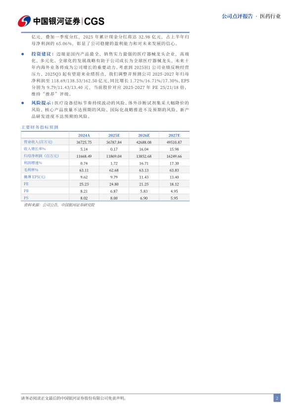 投资建议:迈瑞是国内产品最全、销售实力最强的医疗器械龙头企业,高端化、多元化、全球化的发展战略有助于公司成长为全球医疗器械龙头,未来十年内海外业务将成为公司增长的重要动力。考虑到2025H1公司业绩反映经营压力、2025Q3起有望迎来业绩拐点,我们调整并预测公司2025-2027年归母净利润至118.69/138.53/162.50亿元,同比增长1.72%/16.71%/17.30%,EPS分别为9.79/11.43/13.40元,当前股价对应2025-2027年PE25/21/18倍,维持“推荐”评级。