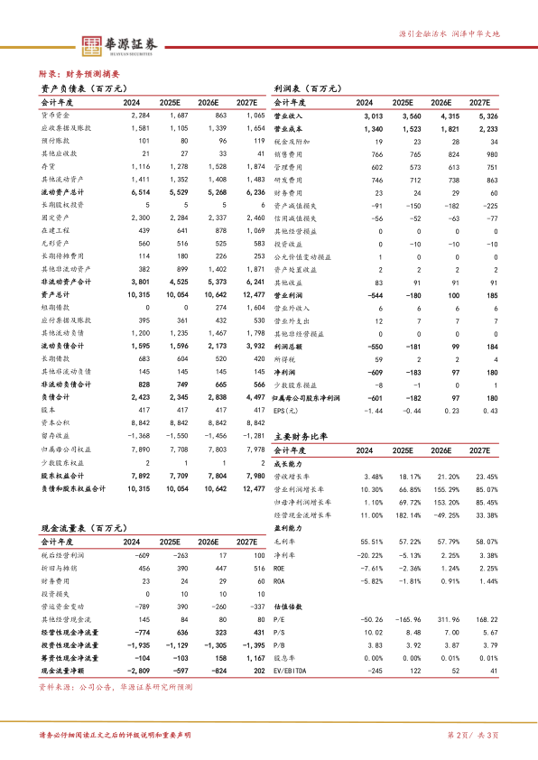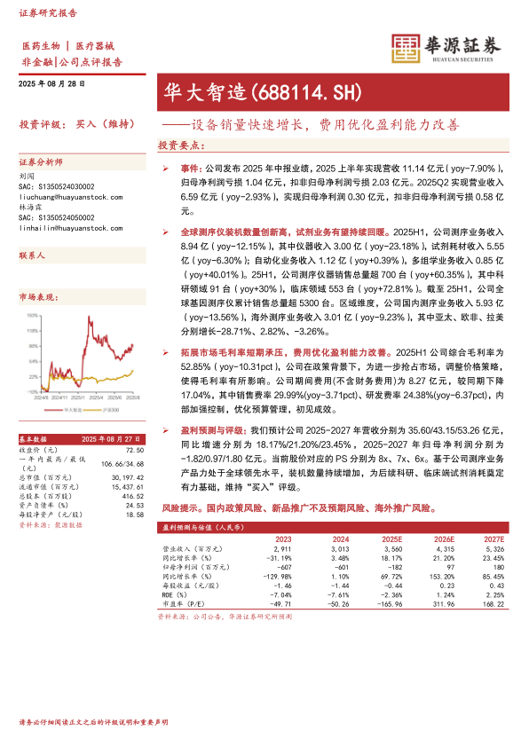 盈利预测与评级:我们预计公司2025-2027年营收分别为35.60/43.15/53.26亿元,同比增速分别为18.17%/21.20%/23.45%,2025-2027年归母净利润分别为-1.82/0.97/1.80亿元。当前股价对应的PS分别为8x、7x、6x。基于公司测序业务产品力处于全球领先水平,装机数量持续增加,为后续科研、临床端试剂消耗奠定有力基础,维持“买入”评级。