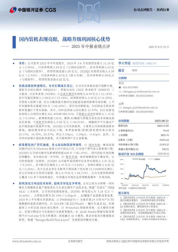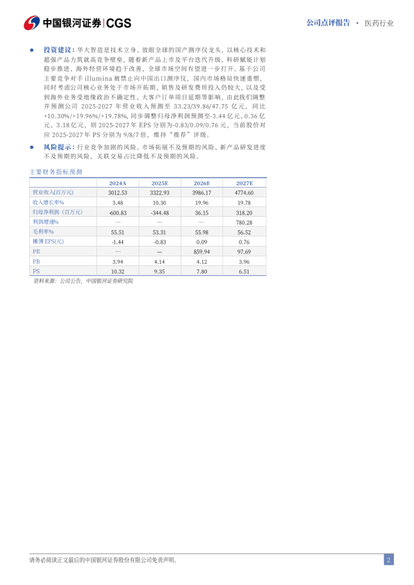 投资建议:华大智造是技术立身、放眼全球的国产测序仪龙头,以核心技术和超强产品力筑就高竞争壁垒,随着新产品上市及平台迭代升级、科研赋能计划稳步推进、海外经营环境趋于改善,全球市场空间有望进一步打开。基于公司主要竞争对手illumina被禁止向中国出口测序仪,国内市场格局快速重塑,同时考虑公司核心业务处于市场开拓期,销售及研发费用投入仍较大,以及受到海外业务受地缘政治不确定性、大客户订单项目延期等影响,由此我们调整并预测公司2025-2027年营业收入预测至33.23/39.86/47.75亿元,同比+10.30%/+19.96%/+19.78%,同步调整归母净利润预测至-3.44亿元、0.36亿元、3.18亿元,则2025-2027年EPS分别为-0.83/0.09/0.76元,当前股价对应2025-2027年PS分别为9/8/7倍,维持“推荐”评级。