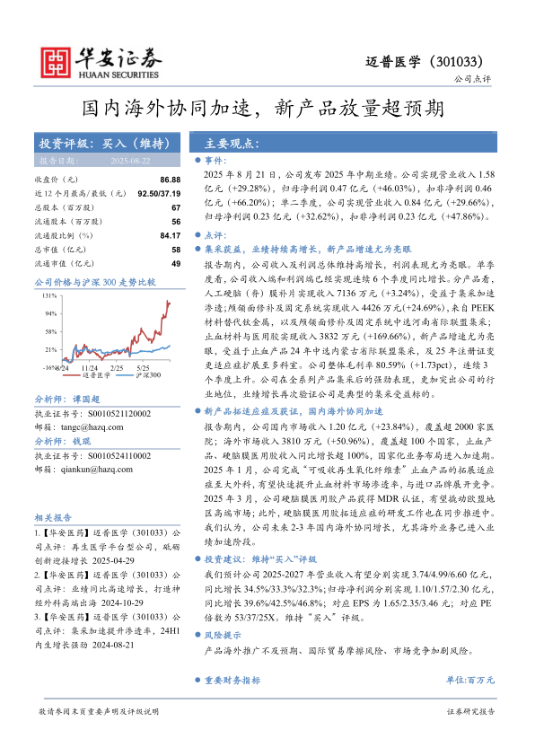 迈普医学2025年中期业绩表现亮眼,集采政策的积极影响显著,新产品市场表现强劲,国内外市场协同发展加速。公司通过不断拓展产品适应症和海外市场,有望实现业绩的持续增长。维持“买入”评级,并对公司未来几年的财务指标进行了详细预测。