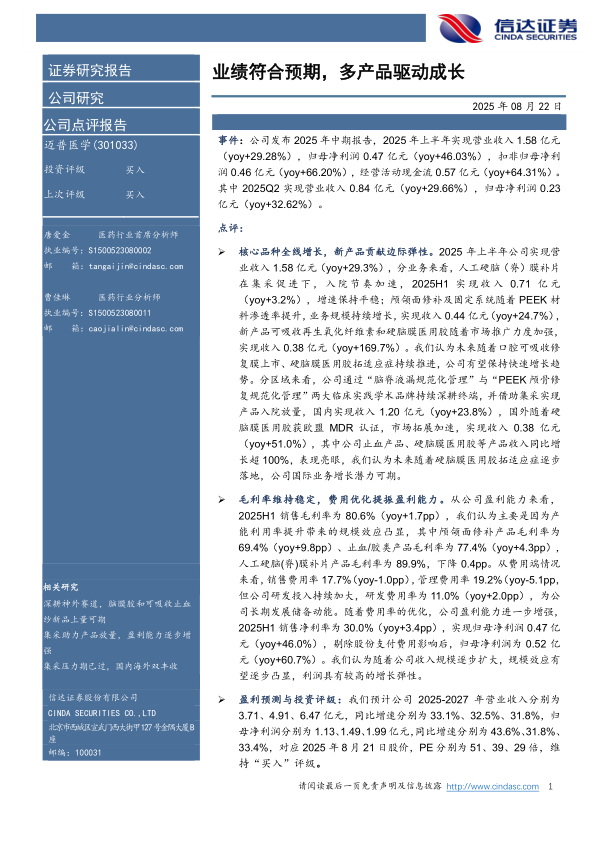 本报告分析了迈普医学2025年中期报告,指出公司业绩符合预期,主要由多产品驱动成长。核心品种如人工硬脑(脊)膜补片和颅颌面修补及固定系统保持稳定增长,新产品如可吸收再生氧化纤维素和硬脑膜医用胶贡献显著边际弹性。