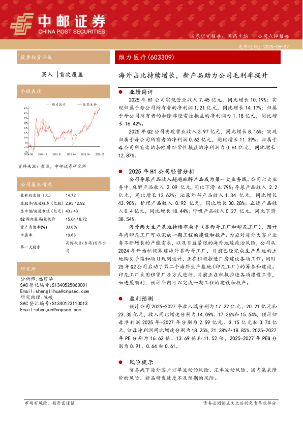 本报告对维力医疗2025年半年度业绩进行了分析,指出公司在营收和利润方面均实现了稳健增长。导尿产品成为公司第一大业务线,海外生产基地的建设将进一步巩固公司在国际市场的地位。同时,报告也提示了贸易战、汇率波动、集采降价以及新品研发进度等风险因素。