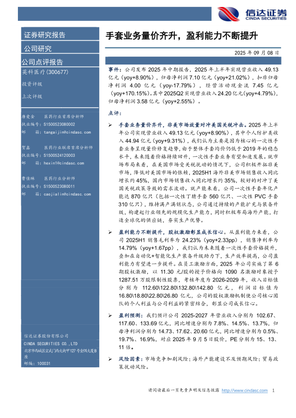 手套业务量价齐升,非美市场放量对冲美国关税冲击。2025年上半年公司实现营业收入49.13亿元(yoy+8.90%),其中个人防护类收入44.94亿元(yoy+9.31%),我们认为主要是因为核心的一次性手套业务呈现量价修复趋势,由于整体手套均价仍低于2019年的稳态水平,未来随着价格持续回升,一次性手套业务有望加速发展。就市场布局来看,在美国市场受关税扰动的情况下,公司积极开拓非美市场,降低对美国市场的依赖,2025H1海外非美市场销售收入同比增长约45%,国内市场销售收入同比增长约35%,较好的对冲了美国关税政策导致的需求波动。就产能来看,公司一次性手套年化产能达870亿只(包括一次性丁腈手套560亿只、一次性PVC手套310亿只),维持满产满销状态,公司通过持续的产能扩充与装备升级,构建起行业领先的规模化生产能力,同时积极布局海外产能,打造全球化的供应链,夯实生产优势。