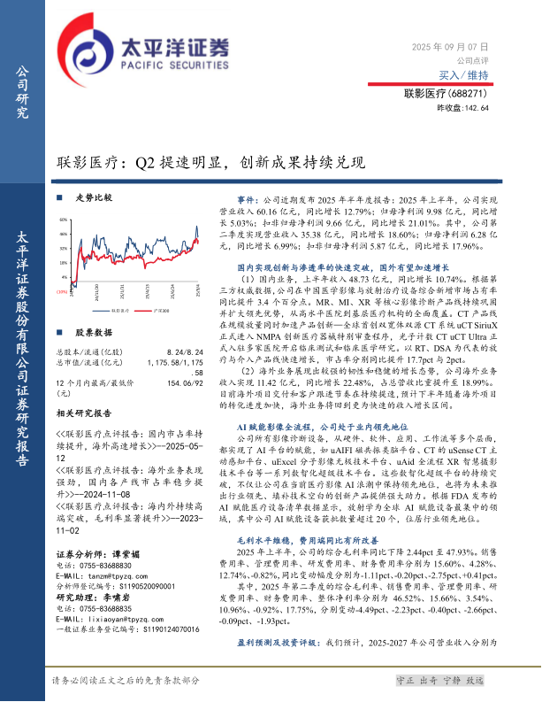 (1)国内业务,上半年收入48.73亿元,同比增长10.74%。根据第三方权威数据,公司在中国医学影像与放射治疗设备综合新增市场占有率同比提升3.4个百分点。MR、MI、XR等核心影像诊断产品线持续巩固并扩大领先优势,从高水平医院到基层医疗机构的全面覆盖。CT产品线在规模放量同时加速产品创新—全球首创双宽体双源CT系统uCT SiriuX正式进入NMPA创新医疗器械特别审查程序,光子计数CT uCT Ultra正式入驻多家医院开启临床测试和临床医学研究。以RT、DSA为代表的放疗与介入产品线快速增长,市占率分别同比提升17.7pct与2pct。
