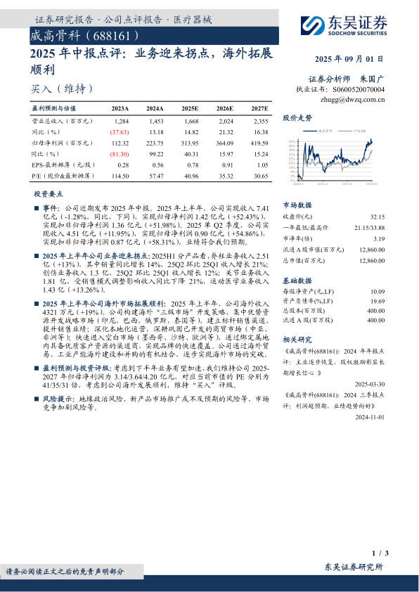 盈利预测与投资评级:考虑到下半年业务有望加速,我们维持公司2025-2027年归母净利润为3.14/3.64/4.20亿元,对应当前市值的PE分别为41/35/31倍,考虑到公司海外发展顺利,维持“买入”评级。