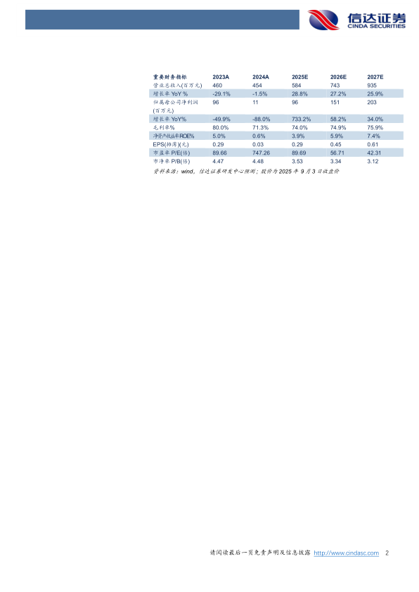 盈利预测:我们预计公司2025-2027年营业收入分别为5.84、7.43、9.35亿元,同比增速分别为28.8%、27.2%、25.9%,实现归母净利润为0.96、1.51、2.03亿元,同比分别增长733.2%、58.2%、34.0%,对应2025年9月3日的股价,PE分别为90、57、42倍。