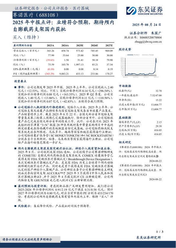 盈利预测与投资评级:考虑到新品推广及研发费用增加,我们将公司2025-2026年归母净利润从0.91/2.19亿元下调至0.31/0.58亿元,预计2027年归母净利润为0.80亿元。对应当前市值的PE分别为433/234/170倍,考虑到公司颅内自膨载药支架有望年内国内上市,维持“买入”评级。