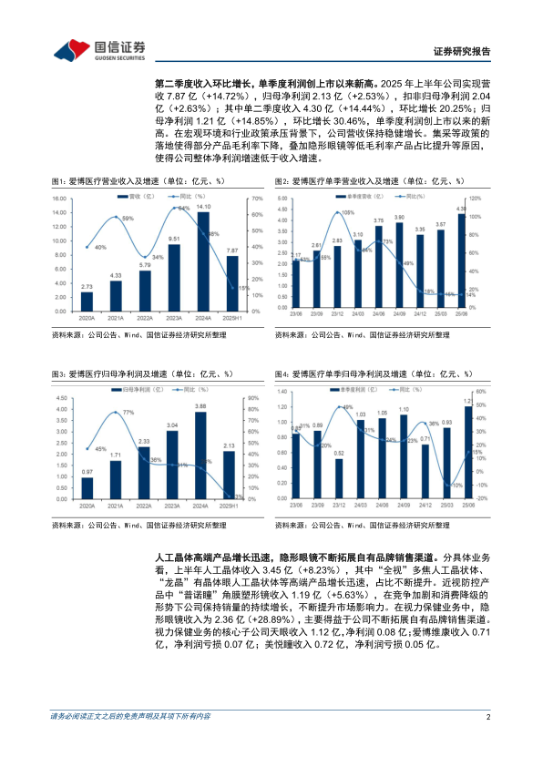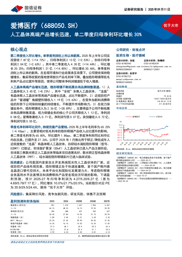 人工晶体高端产品增长迅速,单二季度归母净利环比增长30%