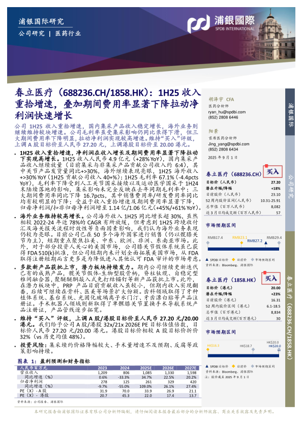 本报告对春立医疗的1H25业绩进行了全面分析,认为公司在集采背景下通过海外市场拓展和新产品研发实现了收入的稳定增长,并通过有效的费用控制提升了盈利能力。维持“买入”评级,并上调了A股和港股的目标价,但同时也提示了投资者需要关注集采政策变化、手术量增速和反腐政策等潜在风险。
