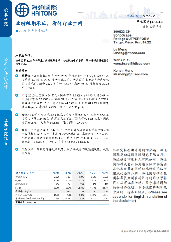 公司发布2025年半年报,业绩短期承压,内镜板块略有增长,维持评级为谨慎优于大市评级。