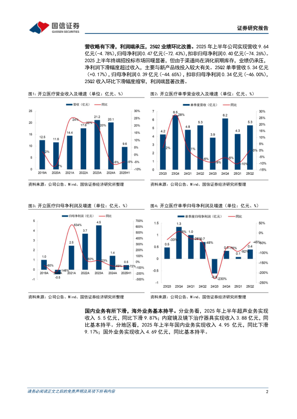 国内业务有所下滑,海外业务基本持平。分业务看,2025年上半年超声业务实现收入5.5亿元,同比下滑9.87%;内窥镜及镜下治疗器具实现收入3.88亿元,同比基本持平。分地区看,2025年上半年国内业务实现收入4.95亿元,同比下滑9.17%;国外业务实现收入4.69亿元,同比基本持平。