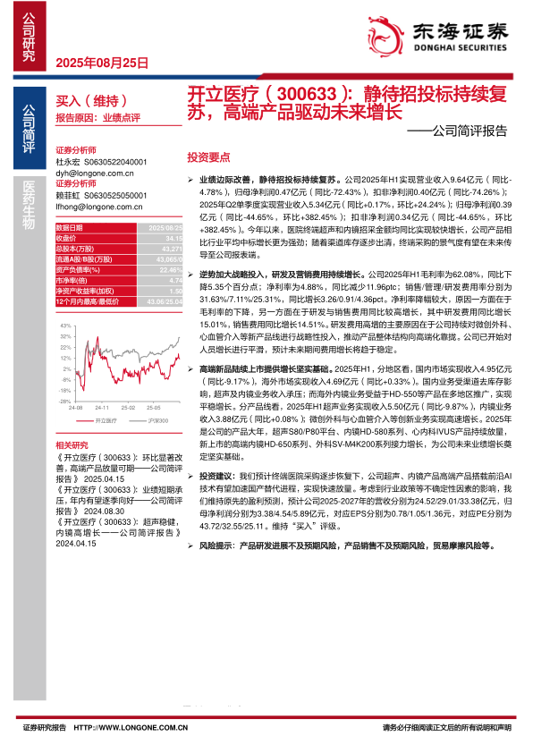 本报告分析了开立医疗2025年半年度的业绩表现,指出公司业绩边际改善,静待招投标持续复苏。公司在加大研发和营销投入的同时,高端产品陆续上市,为未来增长奠定基础。尽管面临一定的风险,但维持对公司“买入”评级,并预测了未来三年的营收和利润情况。