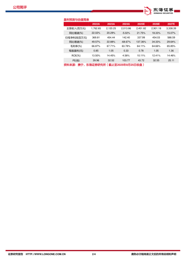 预计公司2025-2027年营收分别为24.52/29.01/33.38亿元,归母净利润分别为3.38/4.54/5.89亿元,对应EPS分别为0.78/1.05/1.36元,对应PE分别为43.72/32.55/25.11。维持“买入”评级。