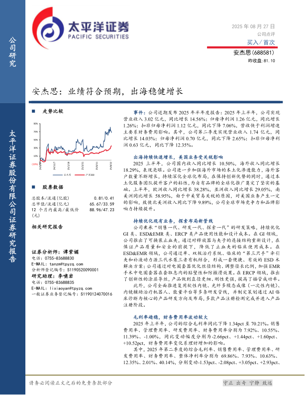 本报告对安杰思2025年半年度业绩进行了分析,认为公司业绩符合预期,海外业务保持稳健增长。公司持续优化现有业务,并积极布局新管线,为未来发展奠定基础。报告同时提示了集采降价、全球贸易波动、产品研发不及预期等风险。基于盈利预测,给予公司“买入”评级。