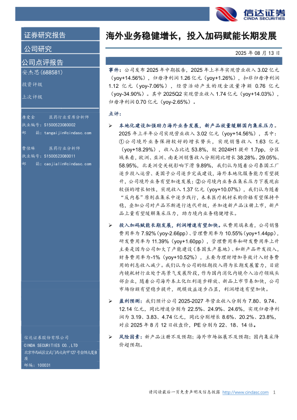 本报告分析了公司2025年中期报告,指出公司海外业务稳健增长,本地化建设加强,新产品放量有助于缓解国内集采压力。公司加码投入赋能长期发展,利润增速有望加快。报告还对公司未来几年的营收和利润进行了预测,并提示了新产品注册、海外市场拓展以及国内集采降价等风险因素。总体而言,公司作为内镜耗材领域的头部企业,具备较好的发展前景。