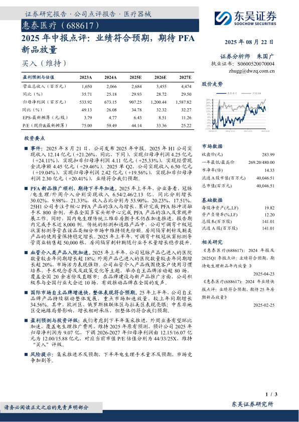 事件:2025年8月21日,公司发布2025年中报。2025年H1公司实现收入12.14亿元(+21.26%,同比,下同),实现归母净利润4.25亿元(+24.11%),实现扣非归母净利润4.11亿元(+25.33%),实现经营现金流净额4.45亿元(+29.46%)。2025单Q2,公司实现收入6.50亿元(+19.04%),实现归母净利润2.42亿元(+19.56%),实现扣非归母净利润2.30亿元(+20.41%),业绩符合我们预期。
