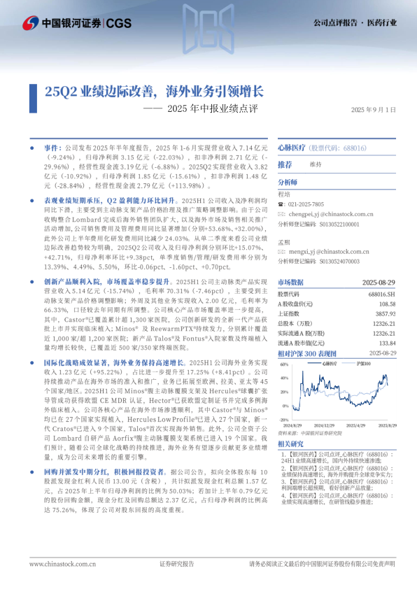 表观业绩短期承压,Q2盈利能力环比回升。2025H1公司收入及净利润均同比下滑,主要受到主动脉支架产品价格治理及推广策略调整影响。由于公司收购整合Lombard完成后海外销售团队扩大,以及海外市场及销售相关推广活动增加,公司销售费用及管理费用同比显著增加(分别+53.68%、+32.00%),此外公司上半年费用化研发费用同比减少24.03%。从单二季度来看公司业绩边际改善趋势较为明确,2025Q2公司收入及归母净利润分别环比+15.07%、+42.71%,归母净利率环比+9.38pct,单季度销售/管理/研发费用率分别为13.39%、4.49%、5.50%,环比-0.06pct、-1.60pct、+0.70pct。