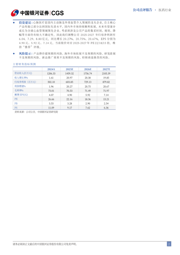 投资建议:心脉医疗是国内主动脉及外周血管介入领域的龙头企业,自主核心产品性能已部分达到国际先进水平,国内外市场持续顺利拓展,未来有望逐步成长为全球心血管领域领先企业。考虑到涉及公司产品的集采时间、规则、降幅等方面仍有较大不确定性,因此我们调整公司2025-2027年归母净利润至6.04、7.29、8.80亿元,同比增长20.27%、20.75%、20.67%,EPS分别为4.90元、5.92元、7.14元,当前股价对应2025-2027年PE22/18/15倍,维持“推荐”评级。