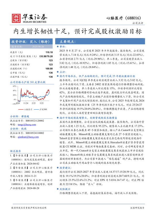 报告期内,公司1Q/2Q单季度分别实现营业收入3.32亿元/3.82亿元,上半年业绩同比下滑,主要系24H2国家医保局进行价格调整影响所致。但从业绩趋势看,单二季度收入环比增长15%,归母净利润环比增长42%,显示出价格调整的影响正逐步减弱,盈利能力环比改善明显。国内产品结构持续优化,尽管主动脉产品因价格调整收入下滑,但公司术中支架和外周产品同比增长较好。我们认为,公司2025年能够完成2024年底发布的股权激励方案(25年净利润不低于6亿元,对应25/26/27年净利润增速19.5%/20.0%/20.0%),价格调整逐步出清,产品结构持续优化,公司收入端有望重回双位数增长趋势。