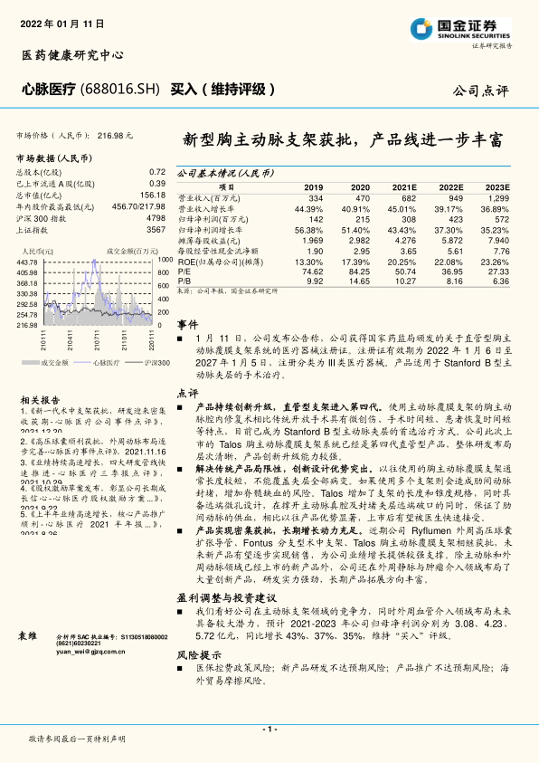 我们看好公司在主动脉支架领域的竞争力,同时外周血管介入领域布局未来具备较大潜力,预计2021-2023年公司归母净利润分别为3.08、4.23、5.72亿元,同比增长43%、37%、35%,维持“买入”评级。