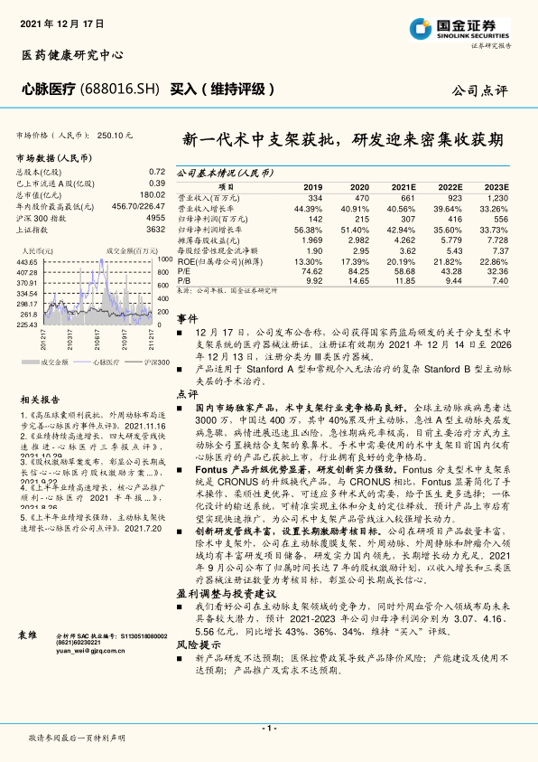 12月17日,公司发布公告称,公司获得国家药监局颁发的关于分支型术中支架系统的医疗器械注册证。注册证有效期为2021年12月14日至2026年12月13日,注册分类为III类医疗器械。