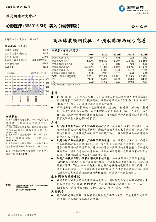 我们看好公司在主动脉支架领域的竞争力,同时外周血管介入领域布局未来具备较大潜力,预计2021-2023年公司归母净利润分别为3.19、4.23、5.56亿元,同比增长48%、33%、32%,维持“买入”评级。