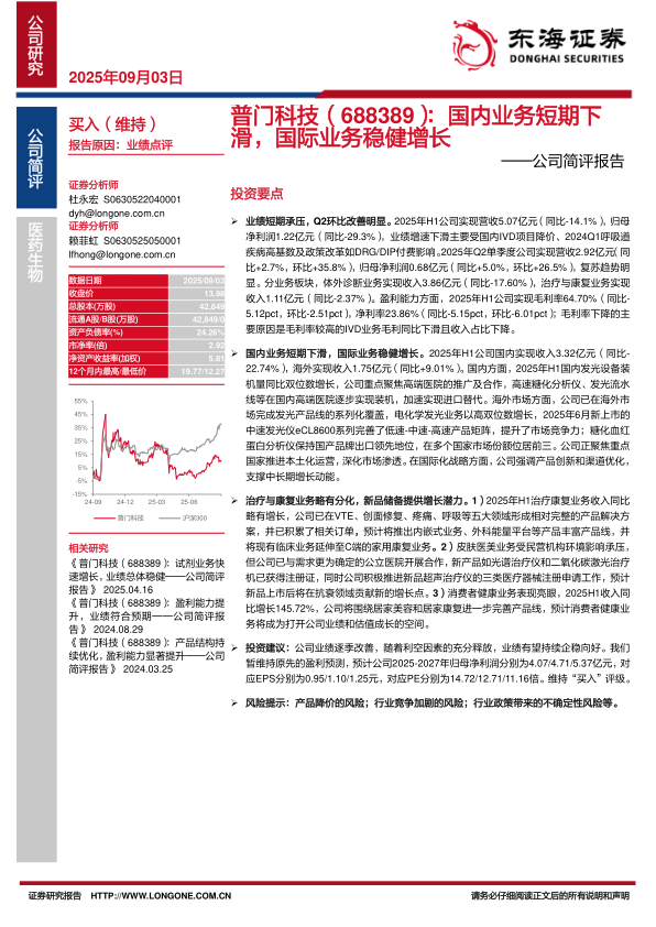 本报告分析了普门科技2025年上半年的业绩表现,指出公司业绩短期承压,但Q2环比改善明显。国内业务受政策和市场因素影响有所下滑,但国际业务保持稳健增长。治疗与康复业务略有分化,但新品储备提供了增长潜力。维持“买入”评级,但需关注产品降价、行业竞争和政策风险。