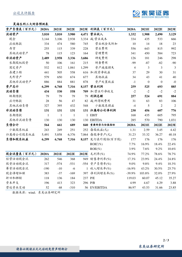 盈利预测与投资评级: 考虑到疫情对于眼科和医美业务产生一定影响,我们将 2021-2023 年公司归母净利润从 4.80/6.42/7.89 亿元, 调整至4.56/6.07/7.76 亿元, EPS 分别为 2.59/3.45/4.42 元 ,对应当前市值的 PE分别为 60X/45X/35X。维持“买入”评级。