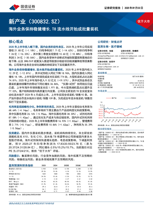 投资建议:国内外仪器装机稳步推进,装机结构持续优化,自主研发的旗舰机发光X10、生化C10、流水线T8有望带动公司突破国内更多大型医疗终端,海外试剂保持快速增长趋势。考虑政策影响,下调盈利预测,预计2025-27年归母净利润为17.83/20.55/23.76亿(原为20.37/24.31/28.84亿),同比增长-2.5%/15.2%/15.7%,当前股价对应PE为27/24/21X,维持“优于大市”评级。
