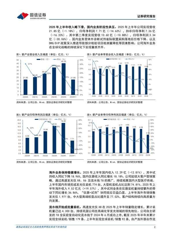 海外业务保持稳健增长,流水线开始成批量装机。2025年上半年国内收入12.29亿(-12.81%),其中试剂收入同比下降18.96%,国内仪器收入同比增长18.18%。上半年国内市场完成发光仪装机774台,大型机装机占比达到74.81%。2025年上半年海外收入9.52亿元(+19.57%),其中试剂业务在仪器装机量持续攀升的带动下同比增长36.86%,“仪器+试剂”协同效应日益凸显。上半年海外市场销售发光仪1,971台,中大型高端机型占比提升至77.02%,客户结构持续向高质量方向发展。公司自主研发的T8全实验室自动化流水线于2024年6月成功上市,上半年实现全球装机/销售92条,自产加外部合作流水线共计装机/销售109条,为完成全年流水线装机/销售目标打下坚实基础。