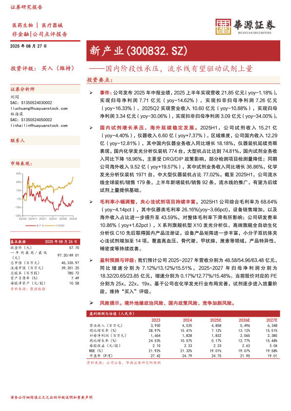本报告分析了新产业(300832.SZ)2025年中报业绩,指出公司国内市场因DRG/DIP政策影响试剂增长承压,但海外市场延续稳定发展态势。