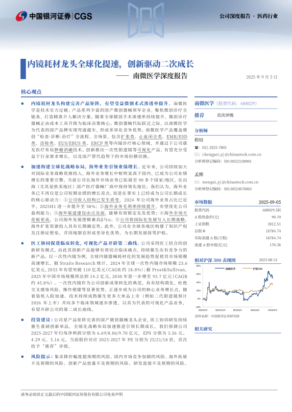 投资建议:公司是产品矩阵完善的国产微创器械龙头企业,医工协同研发持续催生重磅创新单品,全球化战略布局加速推进引领长期成长。我们预测公司2025-2027年归母净利润分别为6.69/8.06/9.70亿元,EPS分别为3.56元、4.29元、5.16元,当前股价对应2025-2027年PE分别为25/21/18倍,首次给予“推荐”评级。