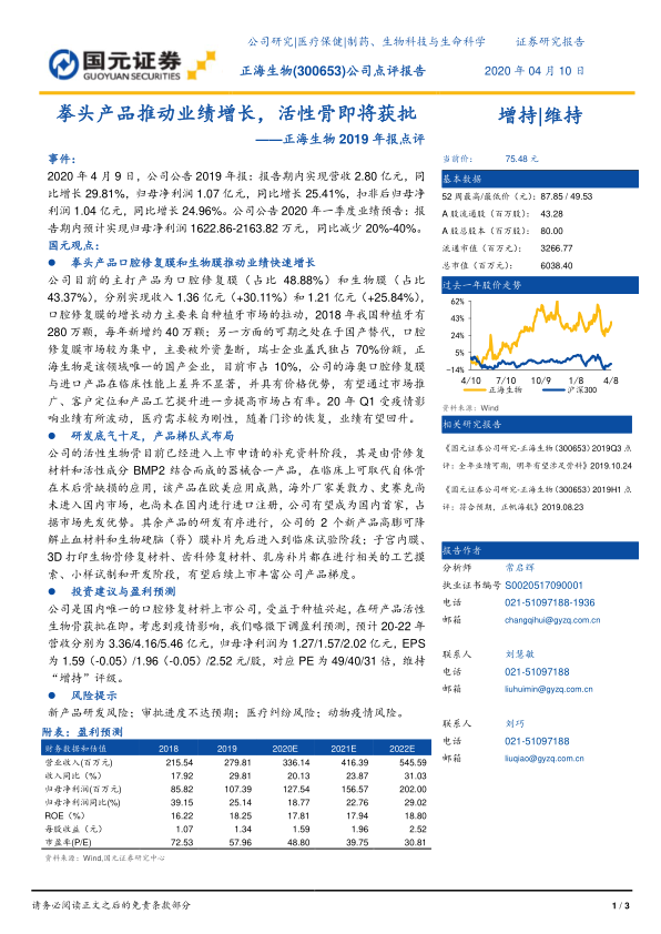 正海生物2019年报点评:拳头产品推动业绩增长,活性骨即将获批