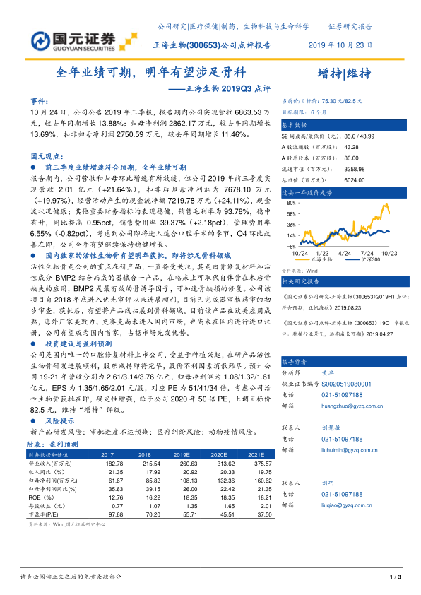 本报告分析了正海生物2019年三季报,认为公司业绩稳健增长,全年可期。公司重点在研产品活性生物骨有望获批,进军骨科领域,为公司带来新的增长点。维持“增持”评级,上调目标价至82.5元。同时,报告也提示了新产品研发风险、审批进度不达预期、医疗纠纷风险和动物疫情风险。