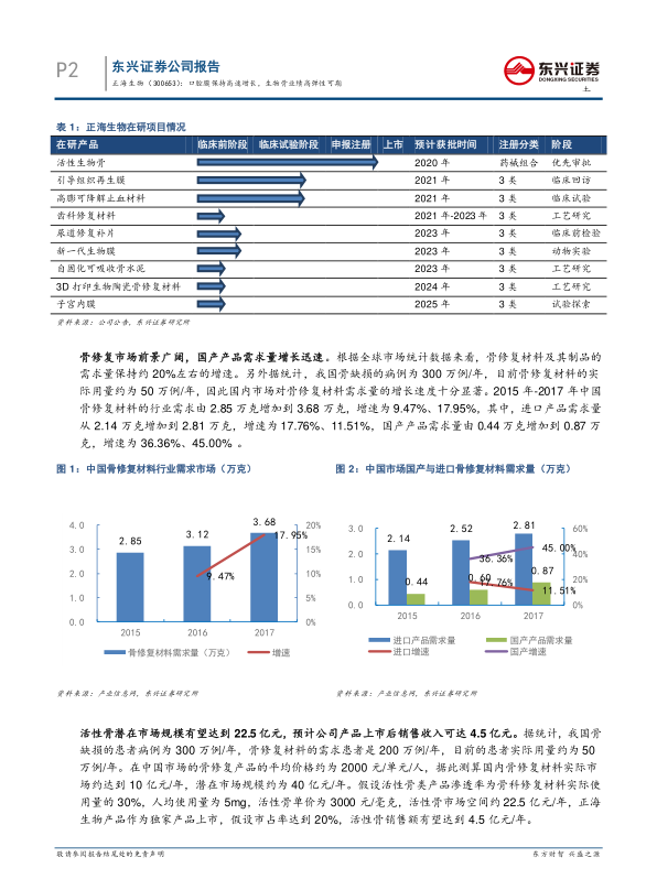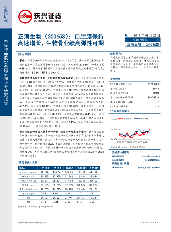 本报告的核心观点是:正海生物的口腔修复膜业务持续高速增长,尤其是在种植牙领域的小规格产品受益于行业发展。同时,公司独家活性生物骨产品预计将在2020年获批,上市后有望贡献显著业绩增长,具有高弹性。