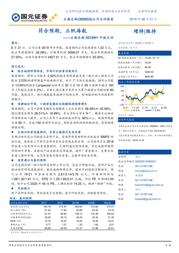 本报告对正海生物2019年半年报进行了点评,认为公司业绩符合预期,维持“增持”评级。报告分析了公司在口腔修复膜和生物膜领域的优势,以及生物活性骨的研发进展。同时,报告也提示了新产品研发、审批进度、医疗纠纷和动物疫情等风险。总体而言,正海生物作为国内口腔修复材料领域的领先企业,具有良好的发展前景。