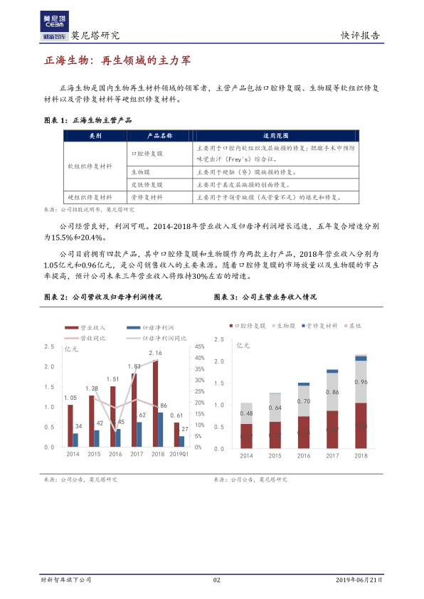 正海生物是国内生物再生材料领域的领军者,主营产品包括口腔修复膜、生物膜等软组织修复材料以及骨修复材料等硬组织修复材料。公司目前拥有四款产品,其中口腔修复膜和生物膜作为两款主打产品,2018年营业收入分别为1.05亿元和0.96亿元,是公司销售收入的主要来源。随着口腔修复膜的市场放量以及生物膜的市占率提高,预计公司未来三年营业收入将维持30%左右的增速。