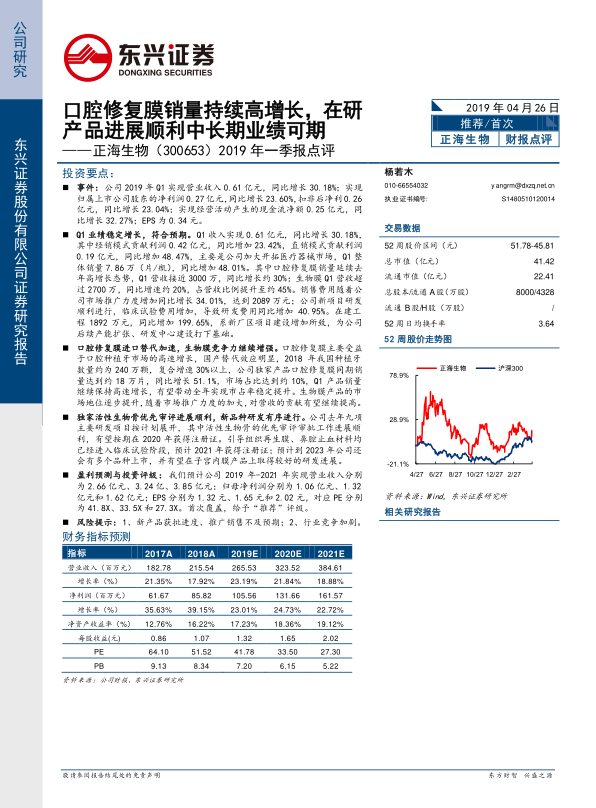 正海生物Q1业绩表现稳健,口腔修复膜销量持续高增长,生物膜市场地位提升。公司在研产品线进展顺利,活性生物骨有望在2020年获批,多个新品种进入临床试验阶段,为公司中长期业绩增长奠定基础。首次覆盖,给予“推荐”评级。