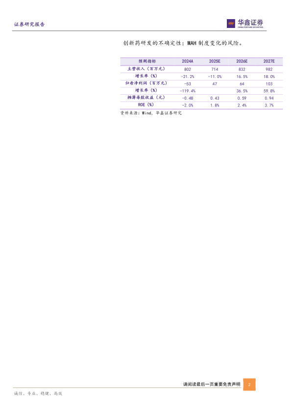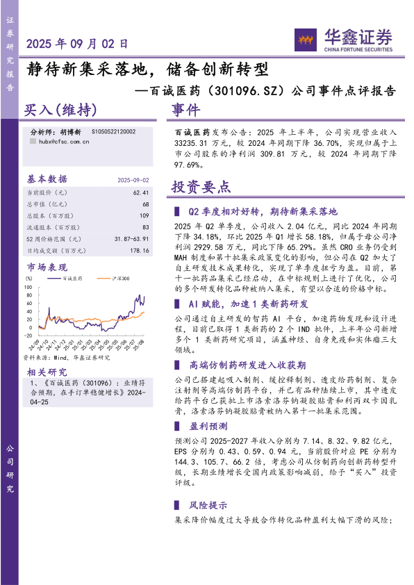 预测公司2025-2027年收入分别为7.14、8.32、9.82亿元,EPS分别为0.43、0.59、0.94元,当前股价对应PE分别为144.3、105.7、66.2倍,考虑公司从仿制药向创新药转型升级,长期业绩增长受国内政策影响减弱,给予“买入”投资评级。