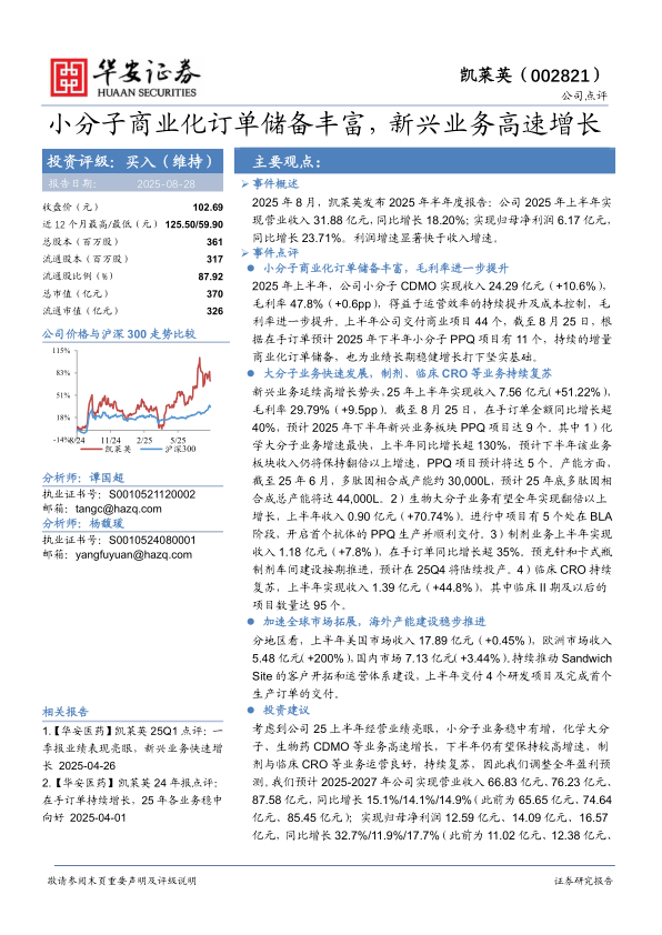 本报告对凯莱英2025年中报进行了深入分析,认为公司小分子CDMO业务稳健,新兴业务高速增长,全球市场拓展顺利,维持“买入”评级。