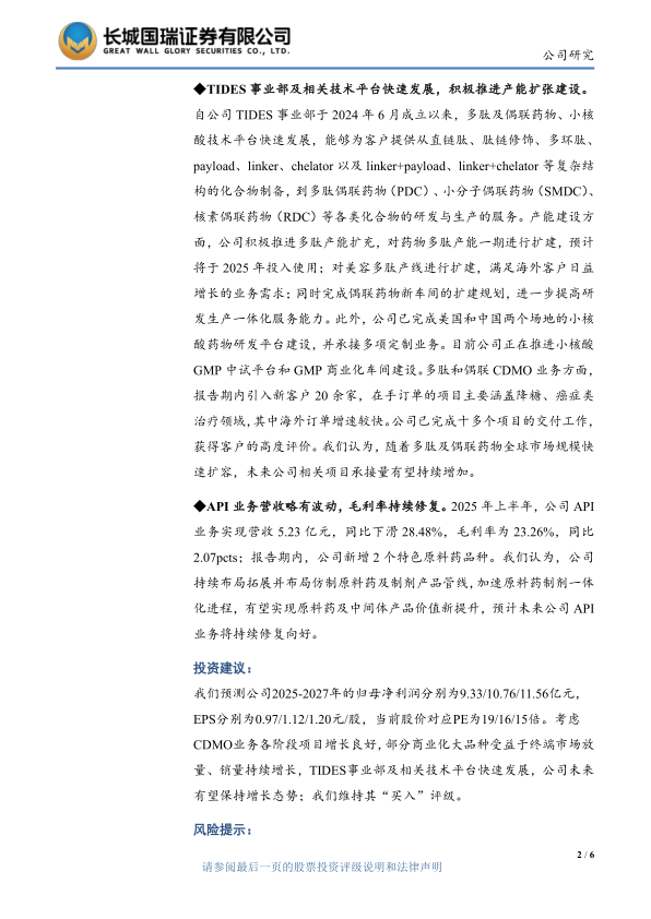 我们预测公司2025-2027年的归母净利润分别为9.33/10.76/11.56亿元,EPS分别为0.97/1.12/1.20元/股,当前股价对应PE为19/16/15倍。考虑CDMO业务各阶段项目增长良好,部分商业化大品种受益于终端市场放量、销量持续增长,TIDES事业部及相关技术平台快速发展,公司未来有望保持增长态势;我们维持其“买入”评级。