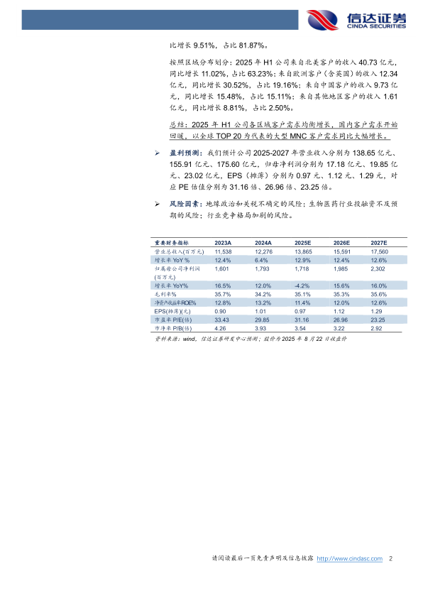 风险因素:地缘政治和关税不确定的风险;生物医药行业投融资不及预期的风险;行业竞争格局加剧的风险。