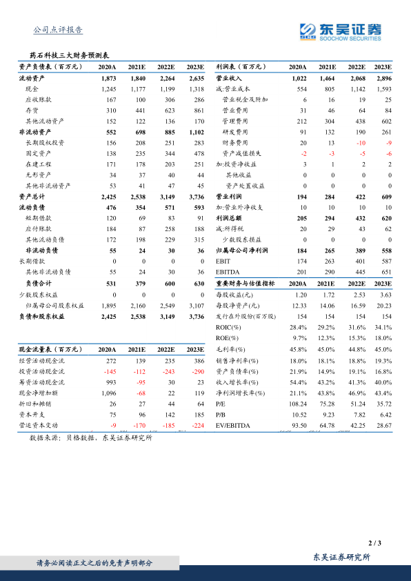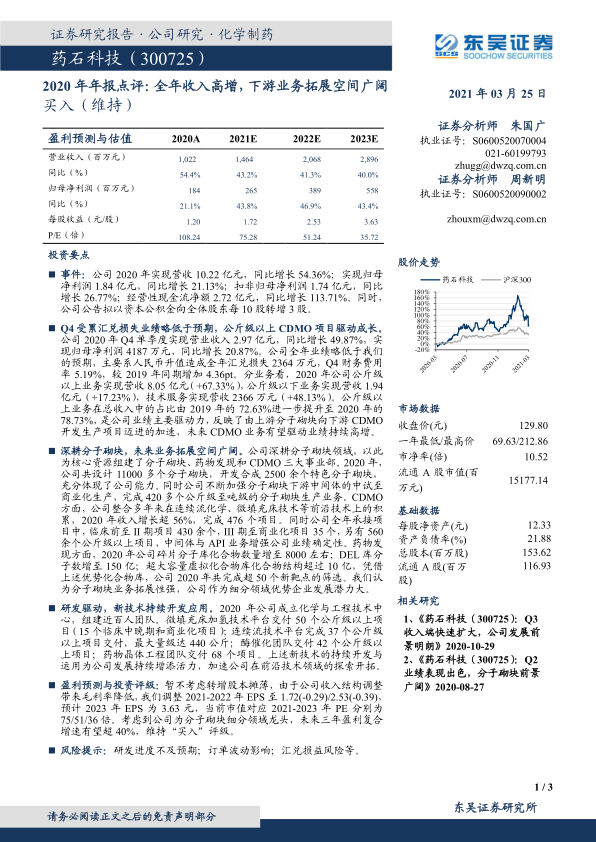 本报告分析了药石科技2020年的财务业绩和未来发展潜力,并维持“买入”评级。