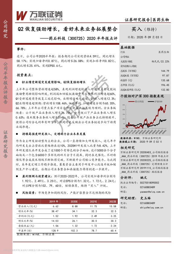 本报告对药石科技2020年半年报进行了全面分析,公司Q2业绩恢复强劲增长,研发投入持续加大,定增项目稳步推进。报告预测公司未来盈利能力将持续提升,维持“买入”评级,但同时也提示了市场竞争和产能扩张整合等风险。