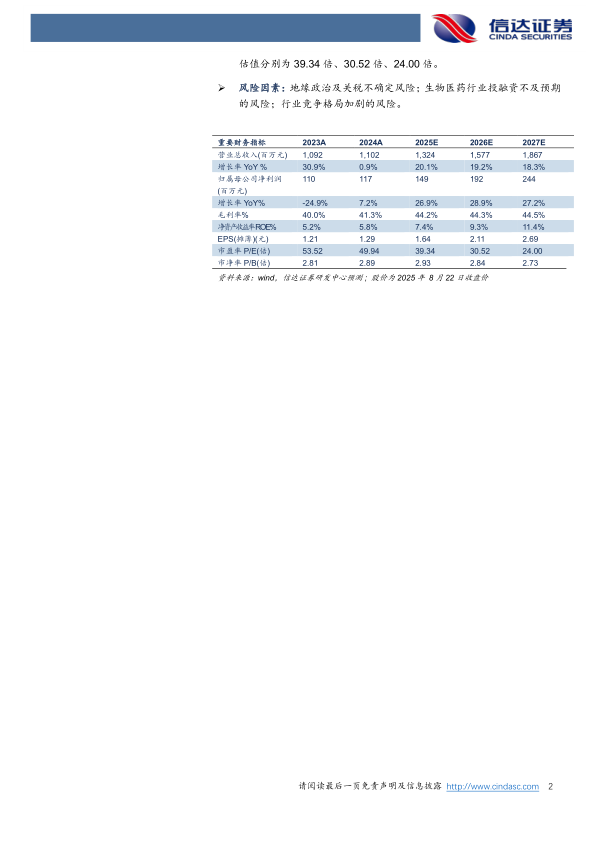 风险因素:地缘政治及关税不确定风险;生物医药行业投融资不及预期的风险;行业竞争格局加剧的风险。
