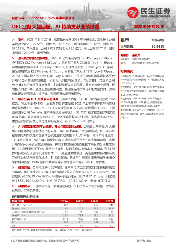 成都先导2025年上半年业绩表现亮眼,DEL业务大幅回暖,AI技术持续贡献业绩增量。公司通过结构性调整研发投入,提升资源配置效率。维持对公司未来营收和净利润增长的乐观预期,维持“推荐”评级,但需关注下游需求、项目运营、技术人员流失、政策变化和汇率等风险。