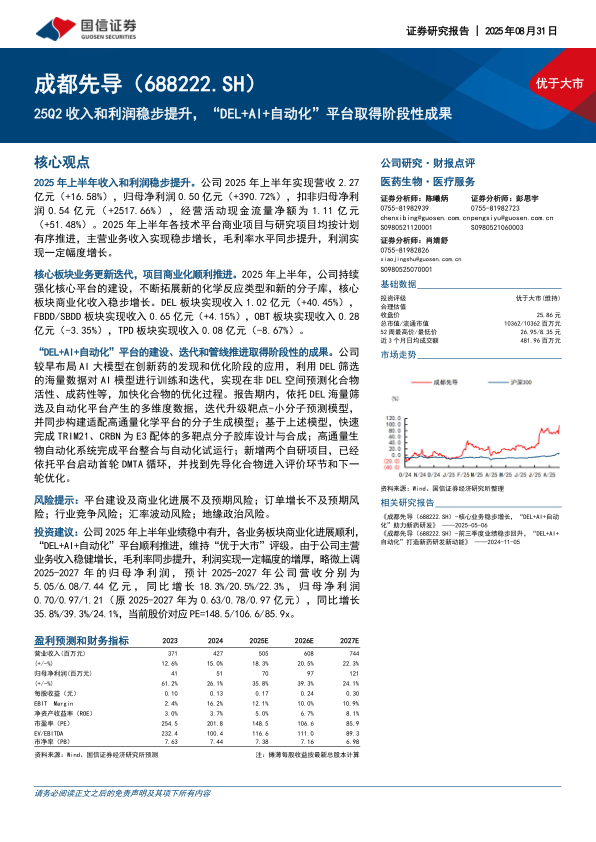投资建议:公司2025年上半年业绩稳中有升,各业务板块商业化进展顺利,“DEL+AI+自动化”平台顺利推进,维持“优于大市”评级。由于公司主营业务收入稳健增长,毛利率同步提升,利润实现一定幅度的增厚,略微上调2025-2027年的归母净利润,预计2025-2027年公司营收分别为5.05/6.08/7.44亿元,同比增长18.3%/20.5%/22.3%,归母净利润0.70/0.97/1.21(原2025-2027年为0.63/0.78/0.97亿元),同比增长35.8%/39.3%/24.1%,当前股价对应PE=148.5/106.6/85.9x。